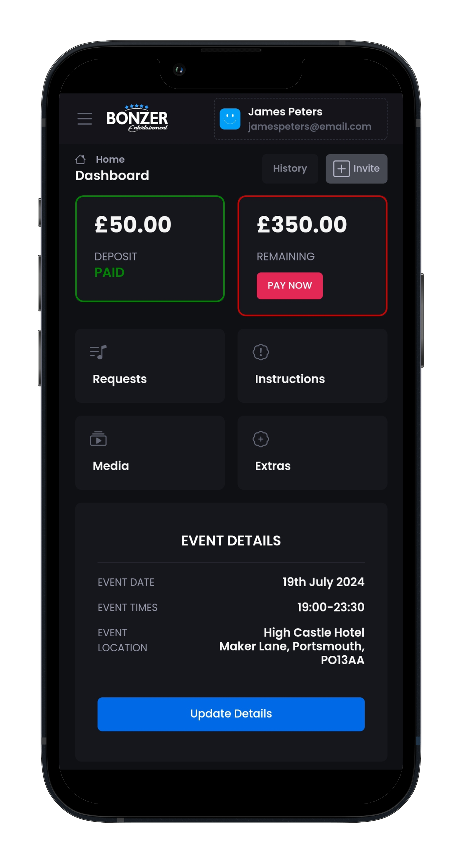 Manage bookings, take online payments, and let your clients personalise their events. With our growing DJ platform, guests can make song requests in advance or live via QR code, and you can take your business to the next century